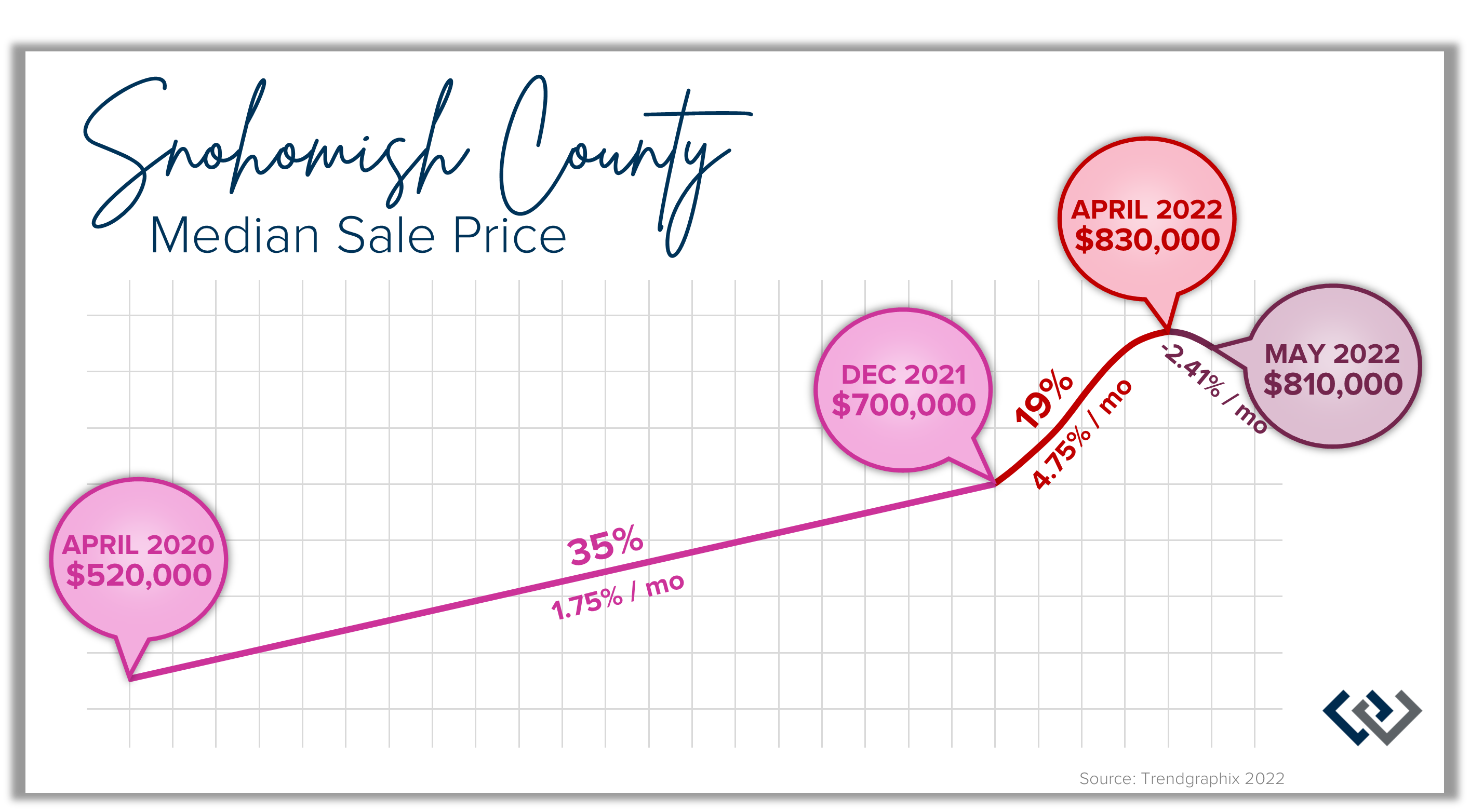Let’s dig a little deeper! In Snohomish County, in December 2021 (the end of last year) the median price was $700,000 which was an above-average 35% increase from April 2020 (20 months). That means there was a 35% gain from April 2020 to December 2021 (20 months: $520,000 to $700,000 = 35%) but then a whopping 19% gain in 4 months, from December 2021 to April 2022 (4 months: $700,000 to $830,000 = 19%). This 4-month stretch of price growth is the root of the unsustainability and one that we will be leveling off of during this shift. It is very unlikely that we will return to prices below the December 2021 level, which was at an above-average growth rate of 35% from April 2020. The (unofficial) median price in May sits at $810,000 indicating the shift to settle somewhere between the April peak and where we landed at the end of last year. We must remember that we were celebrating price growth at the end of 2021!