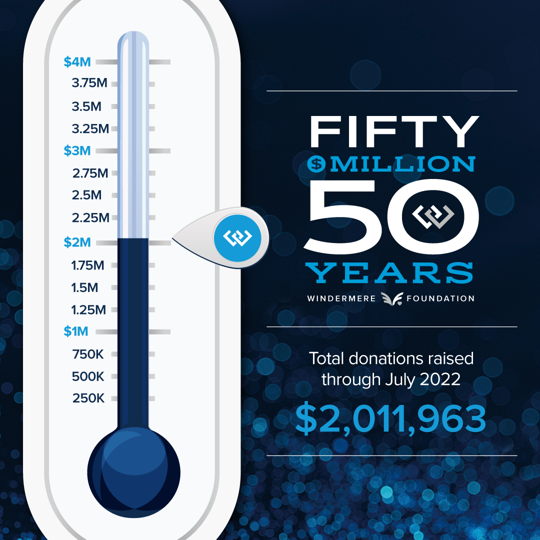 In honor of Windermere’s 50th anniversary, we’ve set a goal to reach $50 million in total donations to the Windermere Foundation in 2022 for our 50 in 50 Campaign. To reach our goal, we need to raise $4 million in donations this year. So far this year, through the month of July, $2,011,963 in donations has been raised for the Windermere Foundation.